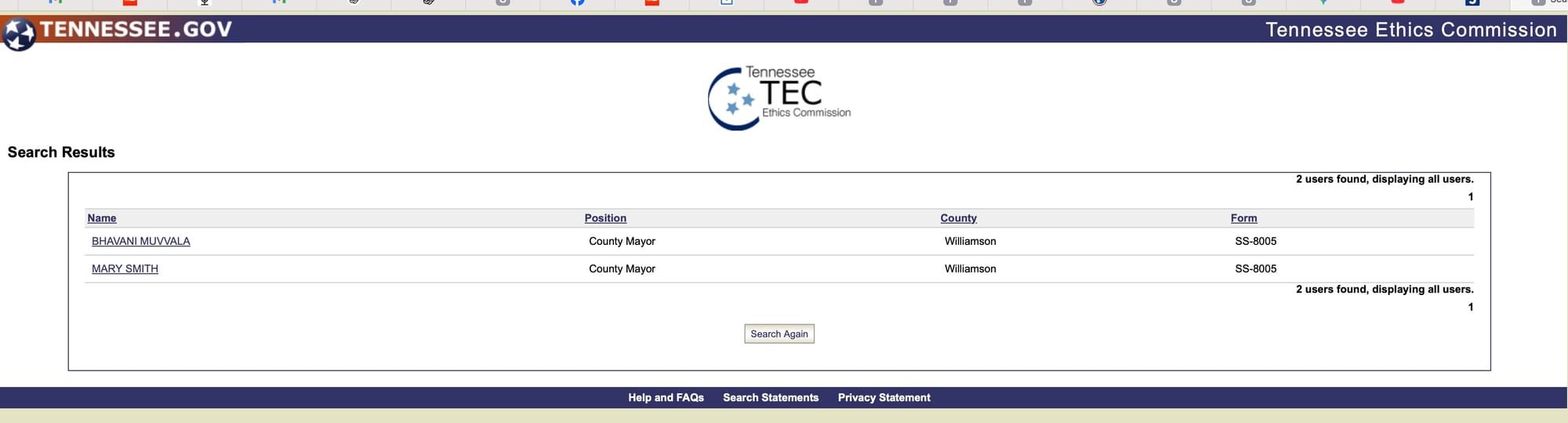 To verify whether the filing had been submitted or posted, TruthWire conducted multiple searches in the Tennessee Ethics Commission’s public database. A search for “Andy Marshall” and “Andrew Marshall” returned no results associated with a Williamson County mayoral candidate. A broader search by position,County Mayor in Williamson County, with no name entered, returned only two candidates: Mary Smith and Bhavani “BK” Muvvala. Marshall’s name did not appear.