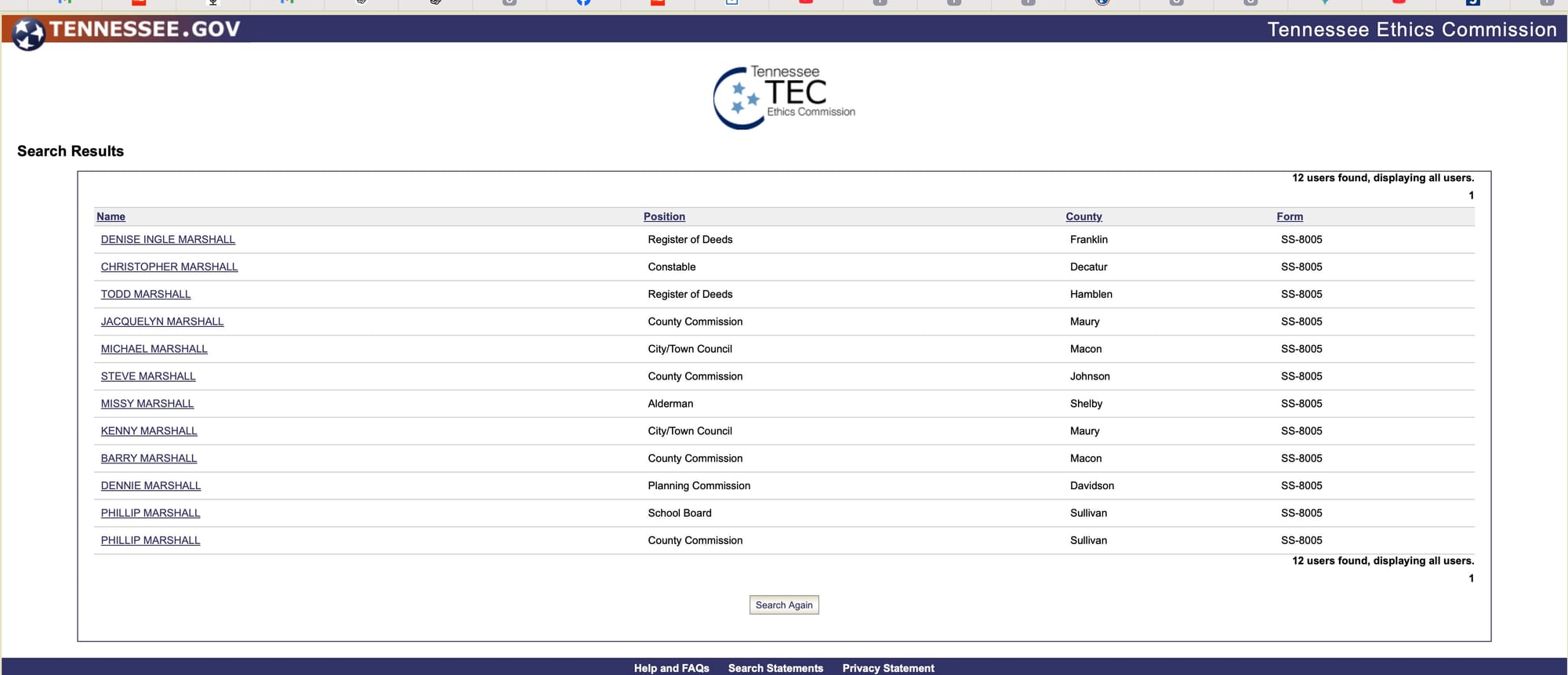 To eliminate the possibility of a filing under a different classification, TruthWire conducted a general search using only the last name “Marshall,” with no filters for position or county. That search returned numerous individuals across Tennessee, confirming the system is active and populated. However, none of those entries included an Andy or Andrew Marshall, nor any candidate for Williamson County Mayor.