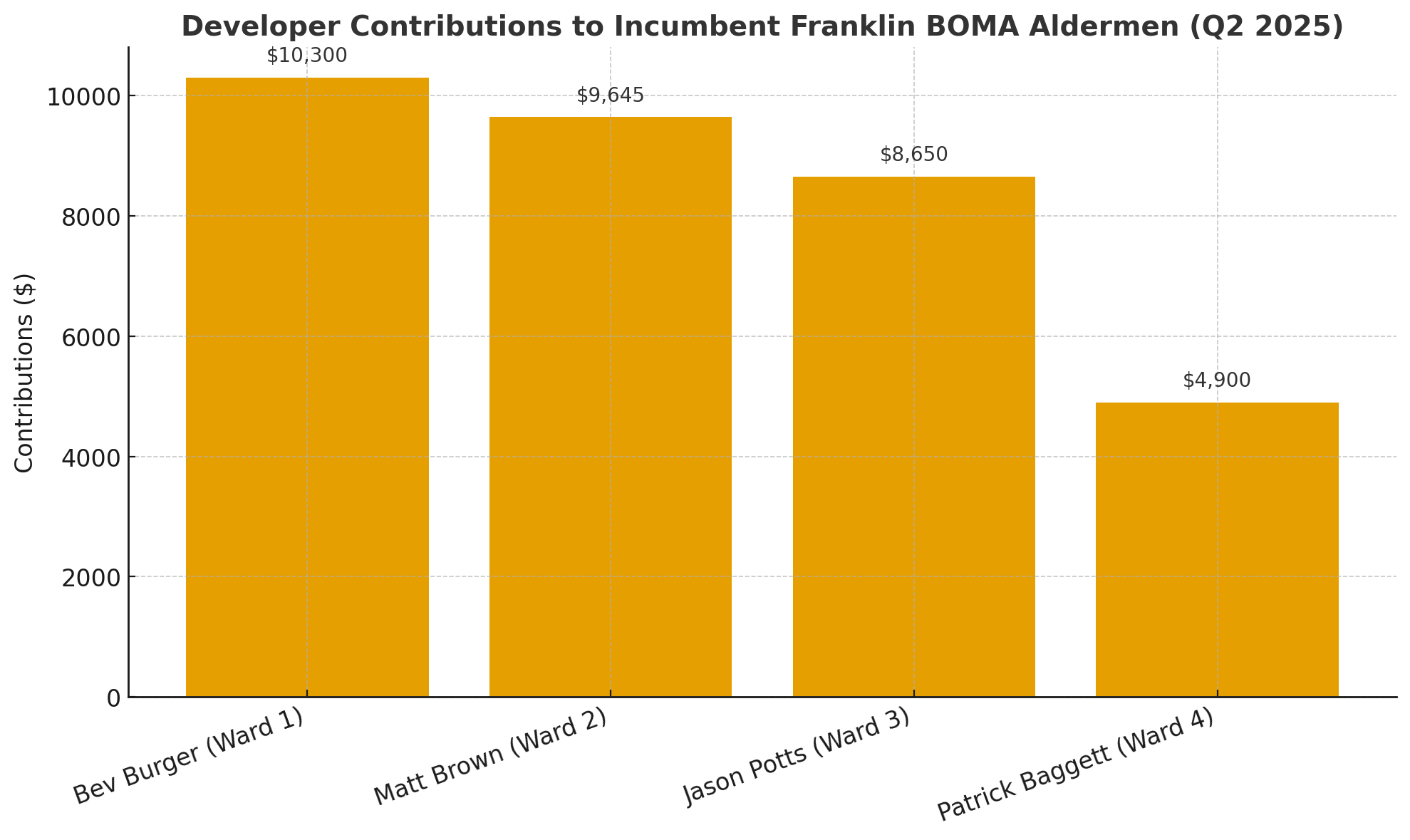 While those numbers may appear small in the broader landscape of American politics — where tens of thousands, even millions, are tossed around like beads at a Mardi Gras parade — the context here matters. Franklin’s alderman races are small, local contests, typically run on modest budgets of only a few thousand dollars. In that setting, developer donations of five, eight, or ten thousand dollars carry outsized influence. What looks negligible compared to congressional fundraising can, at the municipal level, become decisive.