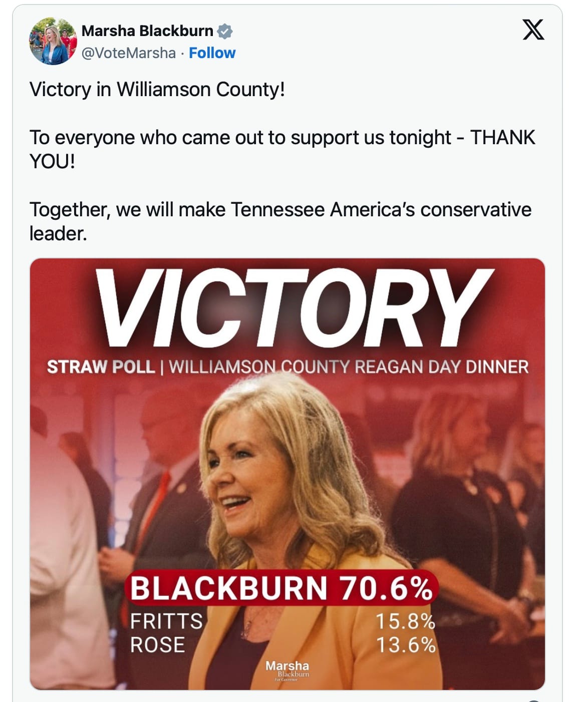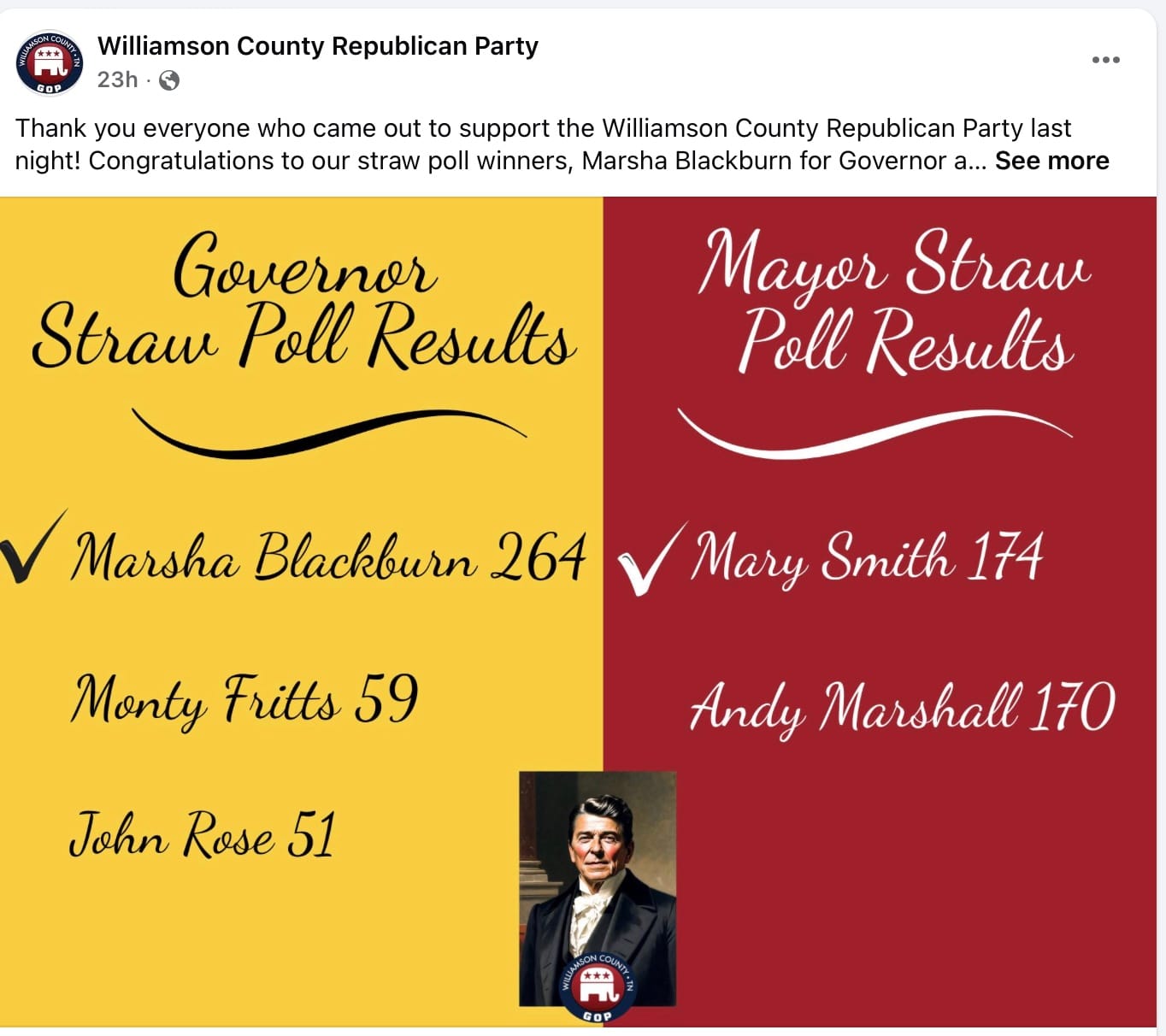 The reaction to the straw poll also illustrates how quickly political narratives can take shape. While the official totals from the Williamson County Republican Party were not released until the following day, after the event concluded, a graphic circulated on social media declaring that Marsha Blackburn the winner of the gubernatorial straw poll.