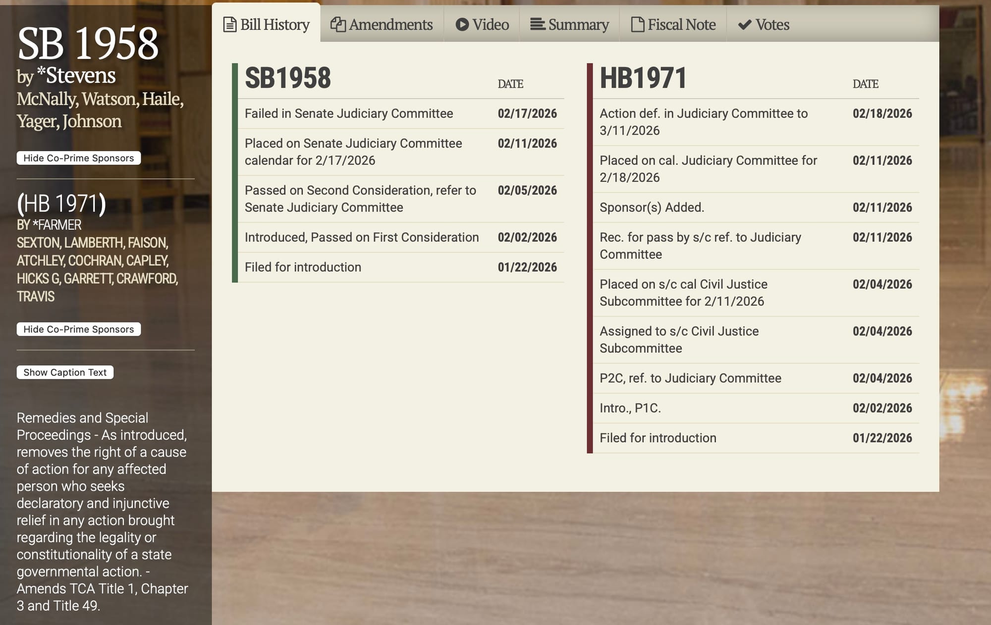 The House companion bill, HB 1971, remains active and is currently scheduled for consideration in the House Judiciary Committee on March 11. Under Tennessee legislative procedure, advancement in one chamber can revive stalled companion legislation in the other. If the House version moves forward, lawmakers in the Senate may again be asked to consider whether Tennesseans should retain pre-enforcement access to constitutional review of state laws.
